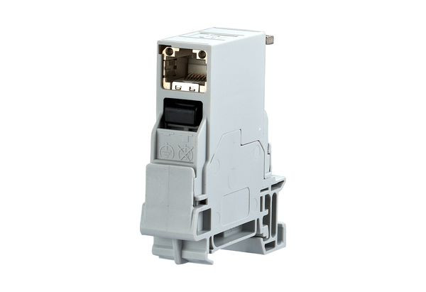 Anschlusseinheit zur Montage auf Tragschiene TH35 nach DIN EN 60715 in Elektroverteilern für Haus- und Industrieinstallation, bestückt mit einem E-DAT Industry RJ45 field jack insert, Steckrichtung senkrecht, 90° zur Tragschiene, Einhaltung der Klasse E, A nach ISO/IEC 11801, DIN EN 50173-1für 10 GBit Ethernet (IEEE 802.3an), Remote Powering (PoE, PoE plus, UPoE, 4PPoE) und HDBaseT geeignet, montagefreundlicher Anschluss der 2- bis 4-paarigen Datenleitung AWG 24/1 - 22/1 und Litzenleiter mit 7-drähtiger CU-Litze AWG 26/7 an BTR 8fach IDC-Schneidklemmen, die Baubreite von 1TE ermöglicht den Einbau von bis zu 12 Geräten in einen Standard-Elektroverteiler, bei Einbau als Gerät der Schutzklasse I erfolgt der Potentialausgleich über eine schaltbare integrierte Potentialausgleichsfeder direkt über die Tragschiene, welche über entsprechende Kontaktierungsklemmen am Gebäudepotentialausgleich anzuschließen ist, Varianten: Beschaltung nach T568A, T568B oder PROFINET