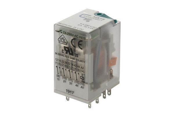 Kompaktes, steckbares Relais für den industriellen Einsatz., Steckzungen sind als Lötfahnen ausgebildet, Mechanische Schaltstellungsanzeige, Mit Handprüftaste, kadmiumfreie Kontakte, LED-Anzeige, Freilaufdiode (nur bei DC Variante)