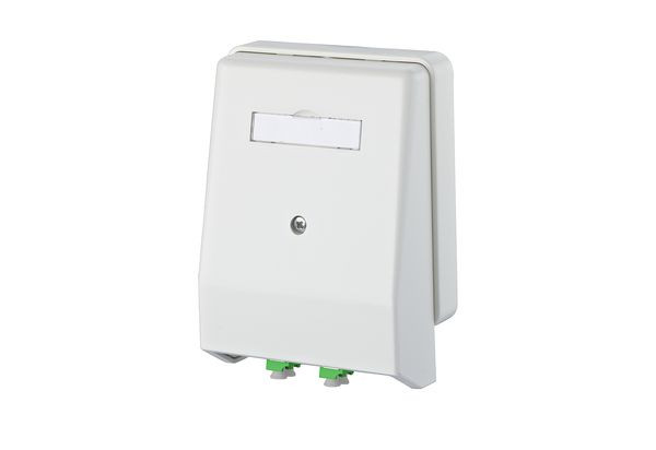 Glasfaser-Anschlusseinheit zur Kanal-/Aufputzmontage mit LWL Kupplungen, Bestückt mit 2 LC-D APC OS2 Kupplungen, Einhaltung eines Biegeradius von ca. 30 mm durch integriertes Kabelreservoir, Steckrichtung 10° nach unten geneigt, Zugentlastung mit Kabelbinder möglich, mit Sichtfenster für beiliegende Beschriftungseinlage, geeignet für vorkonfektionierte Kabel bzw. Stecker-Vor-Ort-Konfektionierung, Geeignet für Mini-Breakout Kabel, Farbe der Abdeckteile reinweiß RAL 9010, Varianten: 2 LC-D, 2 SC-D, 4 ST