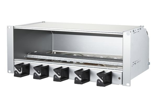 Aluminium-Baugruppenträger (19 Zoll/3+1HE/84TE) mit integrierter Überführungsschublade (1HE) für den Einbau in 19-Zoll-Gestelle, Zur Aufnahme von max. 12 Kompaktmodulen 3HE/7TE mit bis zu 288 Ports auf 3 HE, Mit integrierter Überführungsschublade zur Aufnahme der Bündelader-Überlängen und zur Ablage von ungenutzten Bündeladern, nach hinten ausziehbar, mit Kabelrangierpanel und 5 Kabelbügeln, Mit Schutzblech für den Zuführungsbereich der Bündeladern, Befestigungsmass: 465 mm, Einbaumass: L x H x T 19 Zoll x 4 HE x 295 mm