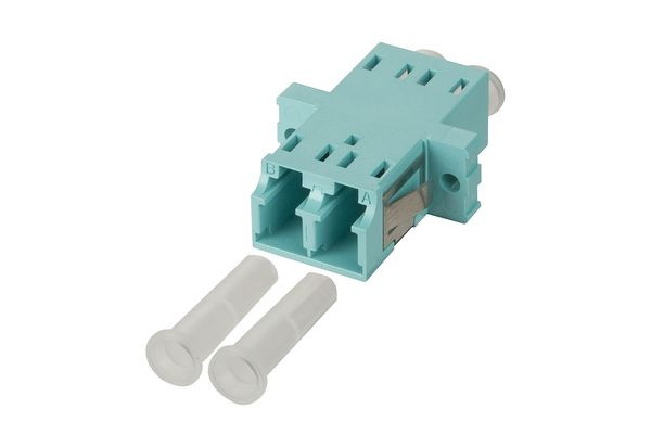 LC-Duplex-Kupplung aus Kunststoff, Bauform SC simplex mit Metall-Clip, geschlitzte Führungshülsen aus Keramik für Singlemode- und Multimode-Anwendungen, mit transparenten Staubschutzkappen für bessere Sichtbarkeit beim Rotlicht-Test, hohe Materialstabilität, Oberflächenqualität und Lebensdauer, Lebensdauer min. 1000 Steckzyklen bei Führungshülse aus Keramik, Schrauben und Muttern im Lieferumfang enthalten, Varianten: blau (OS2), grün (OS2 APC), lindgrün (OM5), violett (OM4), aqua (OM3), jeweils einzeln verpackt oder zu 50 Stück