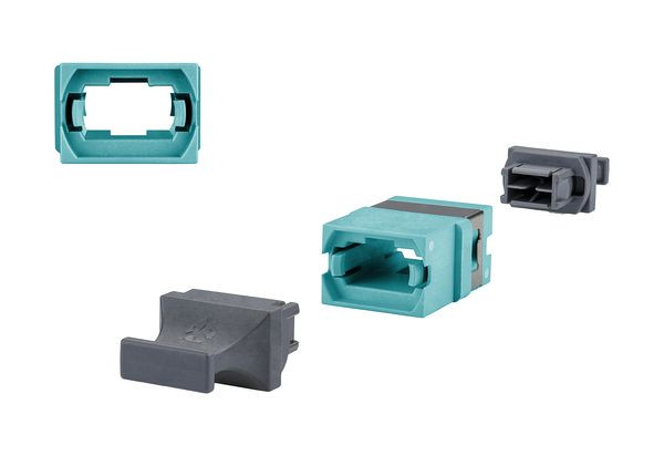 MTP® Kupplung aus Kunststoff, Farbe aqua für OM3, Bauform SC simplex mit Metall-Clip, ohne Flansch, mit zwei Staubschutzkappen, für Belegungsvariante Typ A (key up/ key down = opposed), hohe Materialstabilität, Oberflächenqualität und Lebensdauer, Lebensdauer min. 500 Steckzyklen, Varianten: grün (OS2), lindgrün (OM5), violett (OM4), aqua (OM3), jeweils einzeln verpackt, MTP® ist ein eingetragenes Warenzeichen der Fa. US Conec Ltd., USA