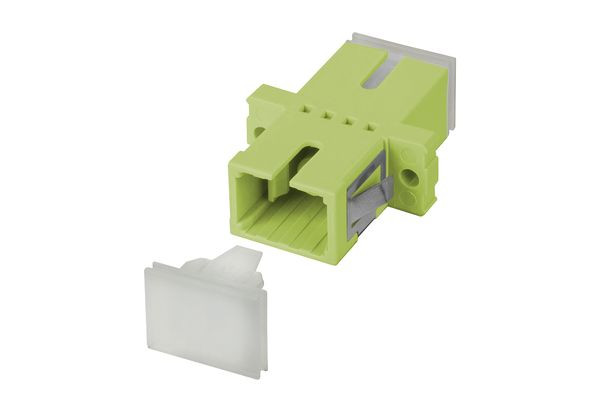 SC-Simplex-Kupplung aus Kunststoff, mit Metall-Clip, geschlitzte Führungshülse aus Keramik für Singlemode- und Multimode-Anwendungen, mit transparenten Staubschutzkappen für bessere Sichtbarkeit beim Rotlicht-Test, hohe Materialstabilität, Oberflächenqualität und Lebensdauer, Lebensdauer min. 1000 Steckzyklen bei Führungshülse aus Keramik, Schrauben und Muttern im Lieferumfang enthalten, Varianten: blau (SM), grün (SM APC), violett (OM4), aqua (OM3), beige (OM2), jeweils einzeln verpackt oder zu 50 Stück