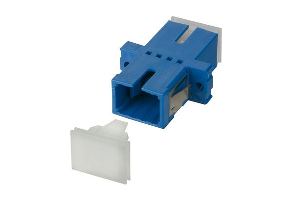 SC-Simplex-Kupplung aus Kunststoff, mit Metall-Clip, geschlitzte Führungshülse aus Keramik für Singlemode- und Multimode-Anwendungen, mit transparenten Staubschutzkappen für bessere Sichtbarkeit beim Rotlicht-Test, hohe Materialstabilität, Oberflächenqualität und Lebensdauer, Lebensdauer min. 1000 Steckzyklen bei Führungshülse aus Keramik, Schrauben und Muttern im Lieferumfang enthalten, Varianten: blau (SM), grün (SM APC), violett (OM4), aqua (OM3), beige (OM2), jeweils einzeln verpackt oder zu 50 Stück