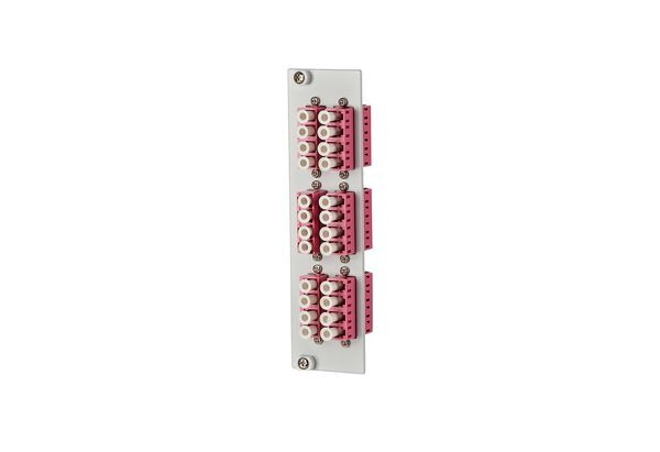 Frontplatte 3HE/7TE mit LC-Q Kupplungen, Führungshülse aus Keramik geschlitzt für Singlemode und Multimode Anwendungen, geeignet für den Einbau in OpDAT REGpro24 und OpDAT REG S, Stahlblech pulverbeschichtet, grau, Varianten: bestückt mit 3 oder 6 LC-Q Kupplungen, jeweils blau (OS2), violett (OM4), aqua (OM3) oder LC-Q APC Kupplungen, jeweils grün (OS2)