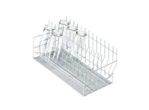 aus Stahldraht rilsaniert, H 221, B 243, T 494 mm, Strebenabstand 103 mm, Strebenhöhe 220 mm, incl. fester Lochblechunterlage, rilsaniert, zum Brechen des Spülstrahls (somit auch für leichte Gläser geeignet), für Unterkorb.