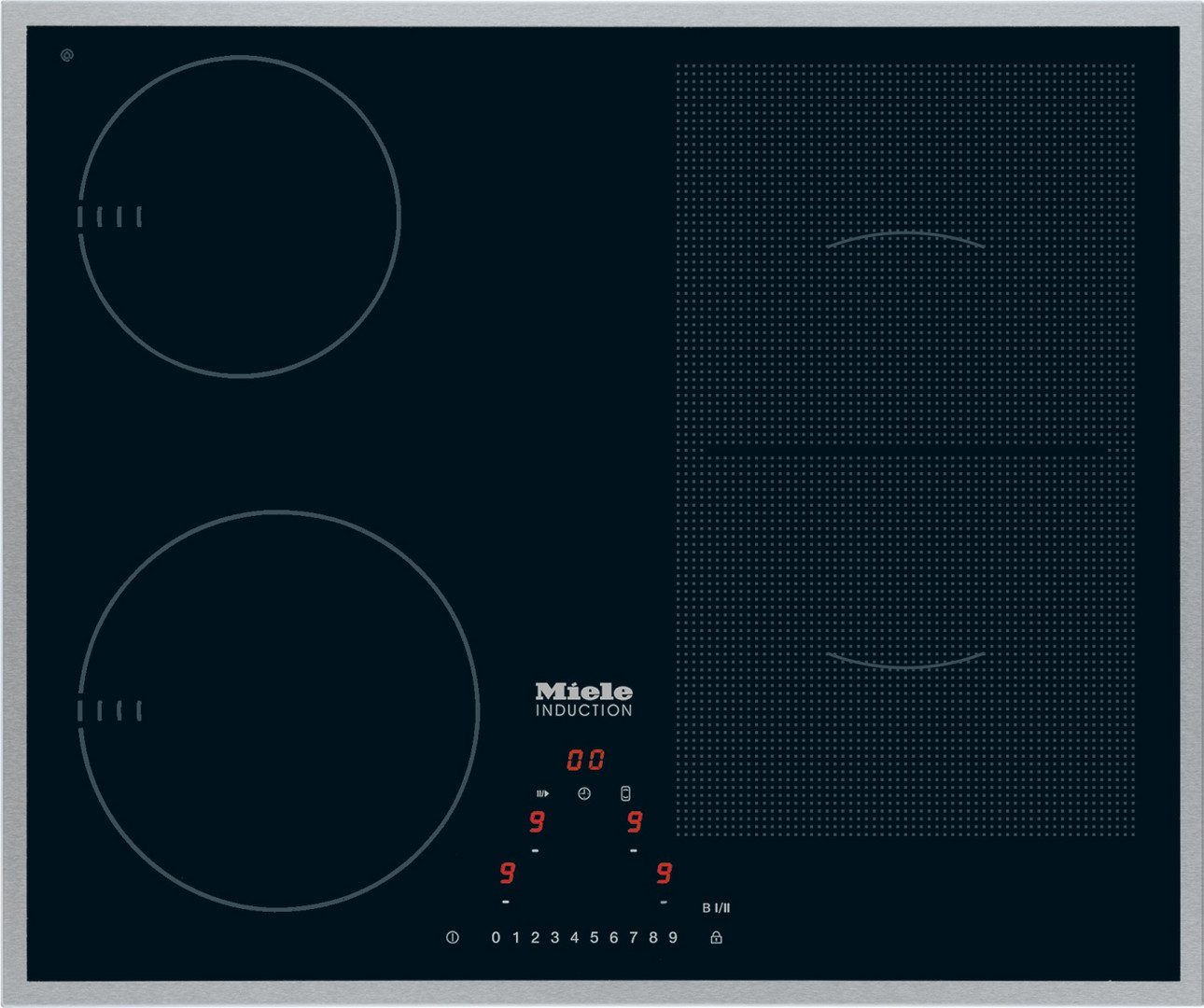 Beheizungsart: Induktion Unabhängig vom Herd Elegante Glaskeramikoberfläche Farbe der Glaskeramik: Schwarz Bedruckungsdesign: LightPrint Edelstahlrahmen Anzahl der Kochzonen: 4 Anzahl: 2 Größe in mm: Ø 150 # 230 Max. Leistung in W: 2100 Max. Booster-Leistung in W: 3000 Max. TwinBooster-Leistung in W: 3700 Position: vorne links Art: Vario-Kochzone Größe in mm: Ø 140-200 Max. Leistung in W: 1850 Max. Booster-Leistung in W: 3000 Position: hinten links Art: Vario-Kochzone Größe in mm: Ø 100-160 Max. Leistung in W: 1400 Max. Booster-Leistung in W: 2200 Position: rechts Art: PowerFlex-Kochbereich Größe in mm: 230x390 Max. Leistung in W: 3400 Max. Booster-Leistung in W: 4800 Max. TwinBooster-Leistung in W: 7300 Bedienung über Sensortasten: Direktanwahl Anzeigefarbe: Rot Topf- und Topfgrößenerkennung Stop&Go-Funktion Kurzzeitwecker Abschaltautomatik Ankochautomatik Warmhalten Individuelle Einstellmöglichkeiten (z.B. Signaltöne) Miele@home Erforderliches nachkaufbares Zubehör: XGW 3000 Automatikfunktion Con@ctivity 2.0 Leicht zu reinigende Glaskeramik Sicherheitsausschaltung Verriegelungsfunktion Inbetriebnahmesperre Integriertes Kühlgebläse Überhitzungsschutz Restwärmeanzeige Abmessungen in mm (Breite): 614 Abmessungen in mm (Höhe): 51 Abmessungen in mm (Tiefe): 514 Einbauhöhe mit Anschlusskasten in mm: 48 Ausschnittmaße in mm (Breite) bei aufliegendem Einbau: 600 Ausschnittmaße in mm (Tiefe) bei aufliegendem Einbau: 500 Gewicht in kg: 10 Gesamtanschlusswert in kW: 7,300 Spannung in V: 230 Frequenz in Hz: 50-60 Länge Anschlusskabel in m: 1,4 Anschlusskabel