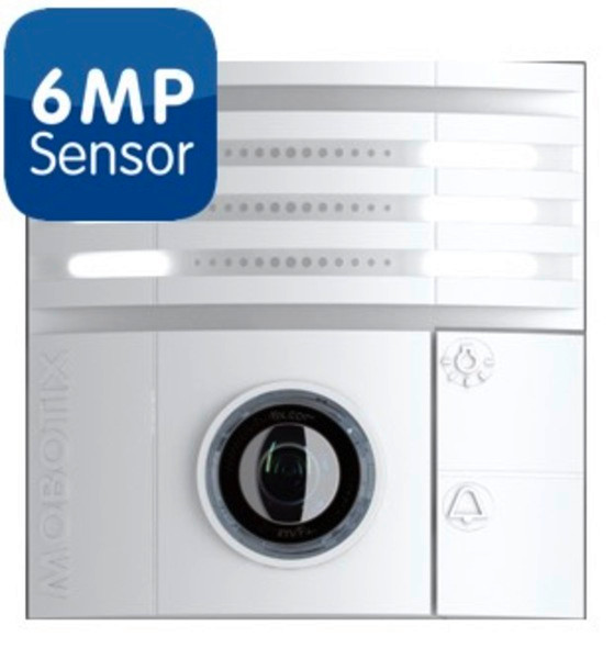 Hemisphärische IP-Türstations-Kamera mit 6 Megapixel Moonlight-Sensor, Farbe (Tag) - HD-Premium Fisheye-Objektiv B016 (Brennweite 1,6 mm, f/2.0, 180° x 180°) - Max. Bildgröße: 6MP (3072 x 2048) - IP65, -30 bis 50 °C - Interner DVR: 4 GB microSD - LED-Lichtleisten, zwei Tasten (Klingel, Außenbeleuchtung), Temperatursensor, Erschütterungssensor, MxActivitySensor, MxAnalytics, Ethernet-Patchkabel 0,5 m/1,6 ft - Schnittstellen: Ethernet 10/100 (RJ45 und LSA), MxBus, USB - Farbe: Weiß