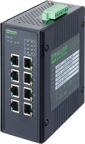 Power over Ethernet ermöglicht einen erheblichen Installationsvorteil. PoE Kameras oder PoE Panel PC, die bislang mit zwei Leitungen verbunden wurden, um Daten zu übertragen und eine Versorgung mit Energie sicherzustellen, müssen nur noch mit einer Leitung angeschlossen werden. Diese überträgt Daten und Energie. Voraussetzung für ein solches Konzept sind PoE-Switches, da sie diese zeitsparende Verdrahtungstechnologie unterstützen. Murrelektronik bietet mit den Komponenten der Baureihe TREE die richtige Lösung. Mit einer Bandbreite von fünf bis acht Ports und der Möglichkeit, sowohl 24 V wie auch 48 V einzuspeisen, können die Anwender den optimal für ihre Applikation passenden Switch auswählen. Ein großer Vorteil von PoE ist, dass man keine besonderen Leitungen benötigt: Für die Installation genügen Standardkabel mit acht Adern in Kombination mit RJ45-Steckverbindern. Je nach Applikation können Netzgeräte eingespart werden.