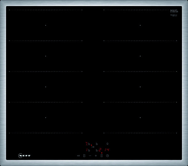 4 Induktions-Kochzonen mit Topferkennung, davon 2 Flexzonen für Kochgeschirr in beliebiger Form und Größe innerhalb der 40 cm langen Zone, Powerstufe für alle Kochzonen, 2 stufige Restwärmeanzeige je Kochzone, 17 Leistungsstufen, Countdown-Timer, Abschalttimer je Kochzone, automatische Sicherheitsabschaltung, Kindersicherung, umlaufender Rahmen