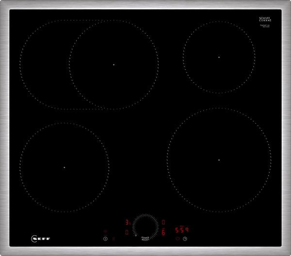 60 cm: Platz für 4 Töpfe oder Pfannen Flexibilität der Kochzonen Bräterzone: Extra zuschaltbare Kochzone für großes Bratgeschirr Kochzone vorne links: 180 mm, 2 kW (maximale Leistung 3.1 kW) Kochzone hinten links: 180 mm, 280 mm, 2 kW (maximale Leistung 3.1 kW) Kochzone hinten rechts: 145 mm, 1.6 kW (maximale Leistung 2.2 kW) Kochzone vorne rechts: 210 mm, 2.5 kW (maximale Leistung 3.7 kW) Benutzerfreundlichkeit Twist Touch®: direkte Leistungssteuerung mit dem aufgedruckten Touch-Ring. Favourite Taste: Mit einer konfigurierbaren Taste direkt auf Lieblingsfunktionen zugreifen. 17 Leistungsstufen: Stelle die Hitze mit 17 Leistungsstufen (9 Hauptstufen und 8 Zwischenstufen) präzise ein. Warmhalte-Funktion, wählbar über Favourite-Taste/Home Connect App (für Geräte, die mit dem Home Connect-Konto verbunden sind): Warmhalten von Speisen bei voreingestellter niedriger Leistungsstufe. Timer mit Abschaltfunktion: Schaltet die Kochzone am Ende der eingestellten Zeit aus (z. B. für gekochte Eier). Wecker (kann anstelle des Abschalttimers ausgewählt werden): Ein Signal ertönt am Ende der eingestellten Zeit (z. B. beim Pastakochen). Die Lautstärke der Signaltöne kann an die persönlichen Vorlieben und Bedürfnisse angepasst werden. Zeitersparnis und Effizienz Powerstufe für Töpfe bei allen Kochzonen: Mit 50 % mehr Leistung z. B. Wasser schneller zum Kochen bringen als auf höchster Leistungsstufe. Power Stufe für Pfannen, wählbar über Favourite-Taste/Home Connect App (für Geräte, die mit dem Home Connect-Konto verbunden sind): Erhitzt Pfannen schneller als auf höchster normaler Leistungsstufe und schützt gleichzeitig die Pfannenbeschichtung. Quick Start Funktion: Beim Einschalten wählt das Kochfeld automatisch die Kochzone aus, auf dem im ausgeschalteten Zustand Kochgeschirr platziert wurde. Restart Funktion: Im Falle von unbeabsichtigtem Ausschalten des Kochfeldes bleiben alle Einstellungen erhalten, wenn du innerhalb von 4 Sekunden wieder einschaltest. Konnektivität Home Connect Funktion (WLAN): Überprüfe, ob das Kochfeld auch dann ausgeschaltet ist, wenn du nicht zu Hause bist und suche in der Home Connect-App nach Rezepten oder zusätzlichen Funktionen. Kochfeldbasierte Haubensteuerung (mit passendem Dunstabzug): Aktiviert den Dunstabzug beim Kochen automatisch, dank der WiFi-Verbindung von Kochfeld und Home Connect Dunstabzug (verbunden mit einem Home-Connect-Konto). Smart Hood Automatic: Der Dunstabzug passt die Leistungsstufe automatisch an, da das Kochfeld kontinuierlich Kochdaten liefert (mit passendem Dunstabzug und verbundenem Home Connect-Konto). Smart Home Trigger (verfügbar mit verbundenem Home Connect-Konto): Öffnen Sie mit der Favoriten-Taste das intelligente Universum Ihres Kochfelds und steuern Sie andere Smart Home Geräte aus Ihrem Haushalt (Partnerservice erforderlich). Aktualisierbares Gerät (verfügbar mit verbundenem Home Connect-Konto): Halten Sie das Gerät immer auf dem neuesten Stand der Software. Design Rahmen: Rahmen in Edelstahl Sicherheit 2-stufige Restwärmeanzeige je Kochzone: Zeigt an, welche Kochzonen noch heiß oder warm sind. Kindersicherung: Verhindert eine unbeabsichtigte Aktivierung des Kochfeldes. Pause-Funktion: Unterbrechen Sie das Kochen, z. B. um die Haustür zu öffnen. Hauptschalter: Alle Kochzonen auf einmal ausschalten. Automatische Sicherheitsabschaltung: Aus Sicherheitsgründen schaltet sich das Kochfeld nach einer voreingestellten Zeit ohne Interaktion automatisch ab. Installation Maße des Gerätes (HxBxT mm): 55 x 583 x 513 Erforderliche Nischenmaße (HxBxT mm): 55 x 560 x (490 - 500) Minimale Arbeitsplattenstärke: 16 mm Gesamtanschlusswert: 7400 W Powermanagement Funktion: Bei Bedarf die maximale Leistung begrenzen (abhängig von der Absicherung der Elektroinstallation).