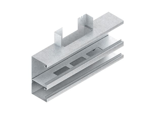 T-Stück 90°, doppelzügig asymmetrisch, ohne Bodenlaschen für die Aufnahme der Trennstege und ohne rückwärtiger Befestigungslochung, mit zwei, mittels nachträglich montierbarem, selbstkontaktierenden Trennprofil aus Aluminium mit Kabeldurchführöffnungen getrennten, unterschiedlich großen Leitungszügen, durch wechselseitige Anordnungsmöglichkeit des gelochten Trennprofils kann bauseitig der Abgang nach oben/unten mit nur einem Formstück realisiert werden, der Potentialausgleich erfolgt über die Potentialausgleichsleitung GSLH... und den Stoßstellenverbinder GSVA... oder die Potentialausgleichsklemme GPK 63, wenn diese elektrisch mit dem Kanalunterteil verbunden werden, Zubehör für den Potentialausgleich bitte gesondert bestellen. Durchgehende Kanalhöhe H = abgehende Kanalhöhe H! VDE zertifiziert! Verwendung für : Gerätekanal DKU 170-78T70 S Abmessungen (ca. Maße) Höhe H x Tiefe T : 170 x 70 mm Länge L : 400 mm Deckelöffnung : 78 mm und 38 mm Teilung der Leitungszüge : 105 mm und 65 mm Trennprofil Kabeldurchführöffnung : 30 x 65 mm mittiger Lochabstand : 85 mm Werkstoff : Stahl, bandverzinkt nach DIN EN 10346