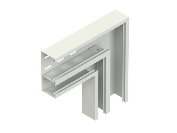 Vertikaleck 90°, Abgang unten, doppelzügig asymmetrisch, ohne Bodenlaschen für die Aufnahme der Trennstege jedoch mit rückwärtiger Befestigungslochung in beiden Schenkel, mit zwei, mittels nachträglich montierbarem, selbstkontaktierenden Trennprofil aus Aluminium, getrennten unterschiedlich großen Leitungszügen, Sichtflächen in RAL Farbton gemäß Herstellerkatalog elektrostatisch pulverbeschichtet, für den Potentialausgleich zwei Stoßstellenverbinder GSVA... je Stoßstelle, bitte gesondert bestellen. VDE zertifiziert! Verwendung für : Gerätekanal DKU 170-78T70 C Abmessungen (ca. Maße) Höhe H x Tiefe T : 170 x 70 mm Deckelöffnung : 78 mm und 38 mm Schenkellänge innen : 200 mm Teilung der Leitungszüge : 105 mm und 65 mm Abgang des 105er Leitungszuges : nach unten zweireihige horizontale Rückenlochung : 7 x 33 mm mittiger Lochabstand : 62,5 mm Reihenabstand : 48 mm Farbton : [Kundenangabe erforderlich] RAL : [Kundenangabe erforderlich] Werkstoff : Stahl, bandverzinkt nach DIN EN 10346