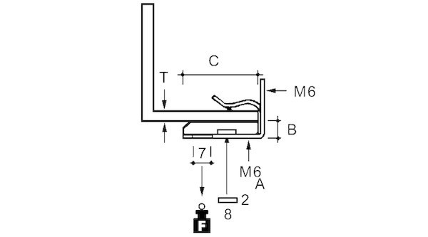 E-Klips, Flanschkralle, zum Aufschlagen mit dem Hammer auf verschiedenste Trägerflansche. Abmessungen (ca. Maße) für Flanschstärke T : 14 - 20 mm Klemmtiefe C : 33 mm Anbauabstand zum Trägerflansch B : 7,5 mm seitlicher und unterer Anschluss : M 6 Anschlusslochung : Ø 7 mm Tragfähigkeit F : 0,45 kN Werkstoff : Stahl, mechanisch verzinkt/passiviert nach DIN EN ISO 9227