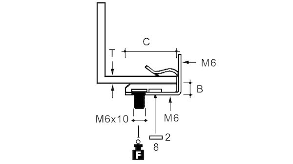 E-Klips, Flanschkralle, zum Aufschlagen mit dem Hammer auf verschiedenste Trägerflansche. Abmessungen (ca. Maße) für Flanschstärke T : 14 - 20 mm Klemmtiefe C : 33 mm Anbauabstand zum Trägerflansch B : 7,5 mm seitlicher und unterer Anschluss : M 6 Gewindeanschluss : M 6x10 Tragfähigkeit F : 0,45 kN Werkstoff : Stahl, mechanisch verzinkt/passiviert nach DIN EN ISO 9227