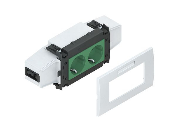 | Kurzbeschreibung | Geräteeinbausystem,vorkonf.,zweifach,Einbaubreite 138,5 mm,NV=250V/16A, Einsatz RAL 6029, Abdeckung RAL 9016, verkehrsweiß, f. Wieland-Stecker |