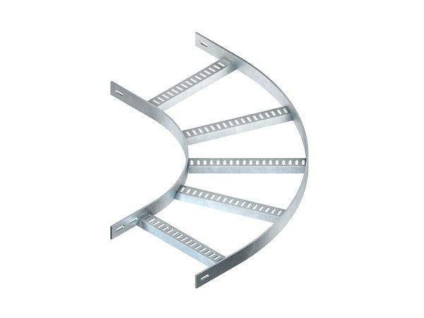 Bogen 90°, für Marinekabelleitern, mit ungelochten Seitenholmen jedoch mit Verbindungslochung für den Anschluss und eingeschweißten, trapezförmigen, perforierten Sprossen, zur Herstellung von 90° horizontal abgewinkeltem Kabelleiterverlauf. Befestigungszubehör für den Anschluss bitte gesondert bestellen. Verwendung für : Marinekabelleiter/Steigetrasse KLMUL 40... Abmessungen (ca. Maße) H x B (innen) : 40 x 700 mm Materialstärke t : 5 mm Innenradius R : 300 mm Werkstoff : Stahl, tauchfeuerverzinkt nach DIN EN ISO 1461