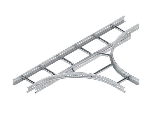 T-Stück, mit durchgehend perforierten und profilierten Seitenholmen, mit eingenieteten Sprossen aus C-Profilen mit 11 mm Schlitzweite, zur Herstellung von horizontalen 90° T-Abgängen. Stoßstellenverbinder KSV 60... bitte separat bestellen. Passende Bügelschellen (BA... und BAK... sowie B... und BK...). für Kabelleiter : KL 60... Abmessungen (ca. Maße) H x B : 60 x 400 mm Länge in Hauptrichtung : 1290 mm + B Länge in Abgangsrichtung : 645 mm + B Innenholmradius R : 500 mm Werkstoff : Stahl, bandverzinkt nach DIN EN 10346