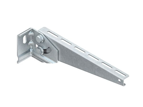 Wandausleger, verstellbar, Verstellbereich +25° bis -60°, zur Befestigung an schrägen Wänden, im Bereich z. B. von Betonröhren und Tunnel, einschließlich feuerverzinkten anteilmäßigem Befestigungszubehör. Die Tragfähigkeitsangaben gelten nur bei ausreichender Verankerung mit dem tragenden Untergrund und einem auf die Schrauben aufgebrachten max. Anzugsdrehmoment von 123 Nm. Bitte beachten: Der zum Einsatz kommende Ausleger, bei einer Neigung des Auslegeranschlusswinkels bis 60°, richtet sich nach der zur schrägen Decke/Wand verfügbaren Höhe und der benötigten Breite der Kabelrinne. Abmessungen (ca. Maße) Auflagehöhe H : 94 mm Breite des Anschlusswinkels B : 52 mm Gesamtbreite B1 : 76 mm Auflagelänge L : 415 mm Gesamtlänge L1 : 440 mm Tragfähigkeit F bei L/2 : 1,4 kN im System geprüft Werkstoff Ausleger : Stahl, tauchfeuerverzinkt nach DIN EN ISO 1461