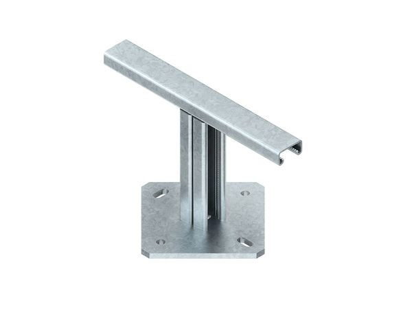 Bodenstütze, symmetrisch, mit verzahnten C-Profilschienen Schlitzweite 22 mm, ungelocht, zur Verlegung von begehbaren Kabelrinnen sowie zur Anbringung darunterliegender Rohrabstandsschellen 85... befestigt mit Gleitmuttern mit Fixierhilfe GMZF M...-22 F (bitte gesondert bestellen) an horizontalen/vertikalen C-Profilschienen, bestehend aus einer horizontalen verzahnten C-Profilschiene und zwei vertikalen gegeneinander stehenden verzahnten C-Profilschienen sowie einer quadratischen Bodenplatte mit Befestigungslochungen. Verwendbar für : begehbare Kabelrinnen Abmessungen (ca. Maße) Auflagehöhe H : 190 mm lichte Innenhöhe zur Schellenbefestigung H1 : 161 mm Auflagebreite B : 400 mm horizontale C-Profilschiene : 41 x 21 x 2,5 mm vertikale C-Profilschienen : 41 x 21 x 2,5 mm Werkstoff : Stahl, galvanisch verzinkt nach DIN EN ISO 19598, blaupassiviert