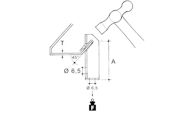 E-Klips, Klemmbügel 45°, zum Aufschlagen mit dem Hammer auf verschiedenste 45° abgewinkelte Trägerflansche. Abmessungen (ca. Maße) für Flanschstärke T : 1 - 3 mm Anschlussbefestigungsloch : Ø 6,5 mm mittiger Abstand zur Oberkante Aufschlagwinkel A : 43 mm Tragfähigkeit F : 0,45 kN Werkstoff : Stahl, mechanisch verzinkt/passiviert nach DIN EN ISO 9227