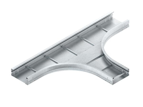 T-Stück, mit gesickten, runden und ungelochten Seitenholmen, mit Verbinderlochung für den Anschluss, formstabil durch den vollflächig eingenieteten, gesickten und ungelochten Boden, für Weitspannkabelrinnen, zur Herstellung von 90° T-Abgängen. Stoßstellenverbinder WSV 105.390 bitte gesondert bestellen. Die Formstückradien sind so ausgelegt, dass die Verlegung der Kabel gemäß DIN/VDE 0298 Teil 3 erfolgen kann. Stoßstellen müssen in unmittelbarer Nähe durch eine entsprechende Tragkonstruktion unterstützt werden. Verwendbar für : Weitspannkabelrinne WRL 105... Weitspannkabelrinne WRU 105... Abmessungen (ca. Maße) Höhe H x Breite B : 105 x 300 mm Länge in Hauptrichtung : 1500 mm + B Länge in Abgangsrichtung : 750 mm + B Innenholmradius R : 500 mm Werkstoff : Stahl, bandverzinkt nach DIN EN 10346
