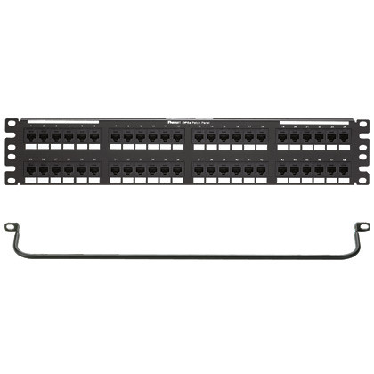 DataPatch 48-Port Auflege-Patchpanel, Kategorie 6 mit 24 RJ45 8-poligen, 8-Draht-Ports. Etikettensatz (DPLK24) und Zugentlastungsleiste (SRB19BL) inbegriffen. Kabelzugentlastungsleiste 2“ länger als das Rack zur Unterstützung von Kabeln in Auflege-Patchpanel-Anwendungen.