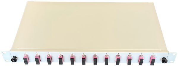 19" Spleissbox Multimode mit Frontblende und montierten Kupplungen mit Keramikhülsen, ausziehbar