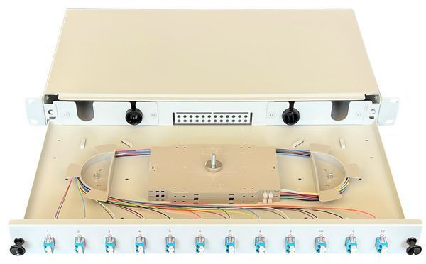 Vorderansicht - geöffnet 19" 1 HE Spleissbox für 12x LCd, 50/125µm OM3 Multimode, stufenlos ausziehbar (Prinzip Schubladentechnik), Stahlblech RAL7035 (lichtgrau), lackiert, komplett spleissfertig, tiefenverstellbar, ausklappbar, untere Ebene entnehmbar, Arretierung mittels Kunststoff-Schnellverschluss. Die Spleissbox ist ab Werk bestückt mit 12x LCd Kunststoffkupplungen, 24x LC/PC Faserpigtails 2.0m (semilos), 02x Standard-Spleisskassetten, 02x Spleisskämmen (Crimp), 02x M20-Kunststoff-Kabelverschraubungen, 02x Kabelspulen zur geordneten Faserführung, Kabelbinder und einem M6x18mm-Käfigmuttern-Set. Alle Faserpigtails sind standardmäßig spleissfertig eingelegt, abgesetzt, in der Spleisskassette beschriftet und geordnet auf den beiden Kabelspulen montiert. Die Kupplungen sind fest & sicher mit Schrauben fixiert. Zur Kabeleinführung befinden sich an der Rückseite 04x M20-Kabeleinführungen, davon 02x mit U-Ausbruch.