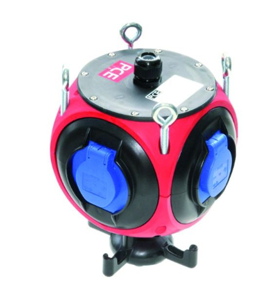 Kunstst.-Hängeverteiler Modell Pegasus IP44 140x140x240 0TE rot; 4xRingschraube oben M8x40 verzinkt; 1xM20 Verschraubung oben (Kabeldurchm. 10-14mm PG16) schwarz; 4xSK-Steckdose 16A 250V IP54 abgesichert d. Vorsicherung Zuleitung; 4xSSD auf Vario-Connector 3polig 10qmm verdrahtet