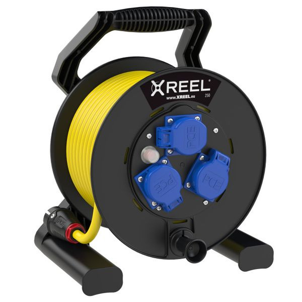 Kabeltrommel XREEL250; Kunststofftrommel (schwarz) mit zentral angeordneter, innenliegender Bremsvorrichtung; Abgedichteter Anschlussraum; Stabiles Kunststoffgestell (schwarz) mit ergonomisch geformtem Tragegriff und 2 Befestigungspositionen für den Stecker; Zentralscheibe mit 3 Schutzkontakt Anbausteckdosen österr./deutsch. System mit Klappdeckel und Dichtrand (1050-0bsw); Nennspannung: 250V ; Nennstrom: 16A; Schutzart: IP54; 1 Thermoschutzschalter; 25m Kabel gelb N07V3V3-F 3G2,5mm2; Taurus2 Schutzkontaktstecker Vollgummi 16A 2p+PE 250V IP54 (0522-sr) zweifaches Erdungssystem; XREEL250 betriebsfertig verdrahtet; Richtlinie (RoHS) 2011/65/EU; Niederspannungsrichtlinie NSpRl 2014/35/EU; Beständigkeit gegenüber UV-Strahlung nach ISO 4892-2; Normen: IEC / EN 61242
