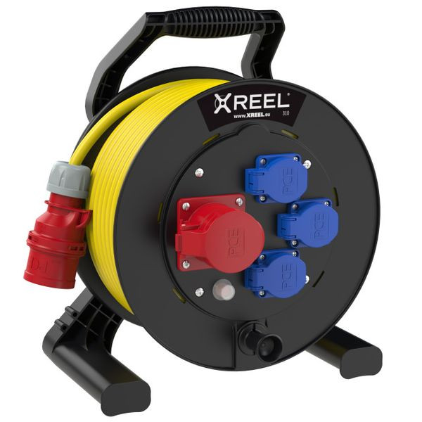 Kabeltrommel XREEL310; Kunststofftrommel (schwarz) mit zentral angeordneter, innenliegender Bremsvorrichtung; Abgedichteter Anschlussraum; Stabiles Kunststoffgestell (schwarz) mit ergonomisch geformtem Tragegriff; Zentralscheibe mit 1 CEE Anbausteckdose 16/5 6h (315-6f7); Nennspannung: 400V ; und 3 Schutzkontakt Anbausteckdosen österr./deutsch. System mit Klappdeckel und Dichtrand (105-0bsw); Nennspannung: 250V ; Nennstrom: 16A; Schutzart Anbaudosen: IP54; 25m Kabel gelb N07V3V3-F 5G2,5mm2; CEE Stecker 16/5 6h IP44 vernickelt (015-6v); XREEL310 betriebsfertig verdrahtet; Richtlinie (RoHS) 2011/65/EU; Niederspannungsrichtlinie NSpRl 2014/35/EU; Beständigkeit gegenüber UV-Strahlung nach ISO 4892-2; nach Norm IEC/EN 61316; Schutzart Gesamtsystem: IP54