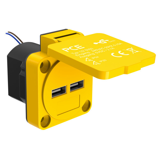 USB Ladesteckdose 5V/2,1A, 2-fach, mit Netzteil zum Laden und Versorgen mobiler Endgeräte mit USB-Stecker; Kunststoffgehäuse, Farbe: ähnl. RAL1023; 2 Stk. USB Typ A Anschlussbuchse zum gleichzeitigem Laden von 2 Endgeräten; Integrierter elektron. Kurzschluss- und Überlastschutz; Eingang: 240V AC, 50/60Hz, 0,15A (ext. Vorsicherung 6A Charakteristik B notwendig); Spannungsversorgung: 2x Anschlussdrähte AWG 22-18, Länge: ca. 180mm; Ausgangsspannung: 2x 5V DC; Leerlaufverbrauch: 0,3W max.; Nennstrom: je Stecker 2,1A - mit integriertem Lastmanagement 2,1A max.; Überspannungskategorie: II, Schutzklassse: II; Abmessungen HxBxT: 62,5x50x50,3 mm, Flanschlochabstand: 38x38 mm; inkl. Flanschdichtung (Gummi); Schutzart: IP54 / IP20 (gechlossener / offener Deckel)