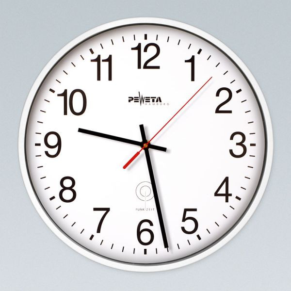 Funkuhr, für Innenanwendung, Ø 250 mm, rund, weißes Kunststoffgehäuse, arabische Zahlen, flaches Mineralglas, Batteriebetrieb 1,5 V