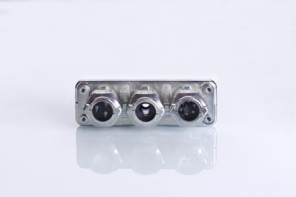 Teilbare Kabeldurchführung UNI FLANSCH HD aus Metall für raue Betriebsbedingungen, passend zu Schaltschrank-Standardausbruch 112x36, für konfektionierte Kabel, 3 integrierte Kabelverschraubungen ausrüstbar mit über 100 M25-Dichteinsätzen aus dem UNI Dicht-Programm passend für viele Kabel, großflächige, schonende Kabelabdichtung, Schutzarten IP 66 und Type 4