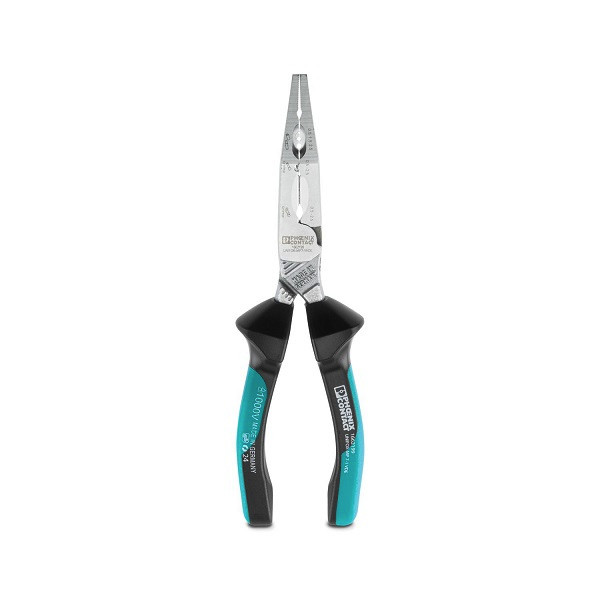 Multifunktionszange, 7 Funktionen in einem Werkzeug, mit Abisolier- und Crimpbereich für Aderendhülsen und isolierte Ringkabelschuhe, mit Seitenschneider, VDE geprüft