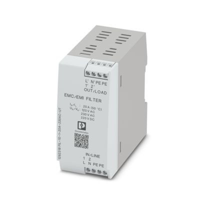 EMV-Filter (Netzfilter) für einphasige AC- und DC-Systeme (Nennspannung: bis 230 V AC, bis 220 V DC), zur Montage auf NS 35, Nennstrom: 20 A