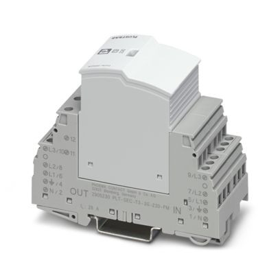 Steckbarer Geräteschutz, gem. Typ 3 / Class III, für 3-phasige Stromversorgungsnetze mit separatem N und PE (5-Leitersystem: L1, L2, L3, N, PE), mit integrierter stoßstromfester Sicherung und Fernmeldekontakt.