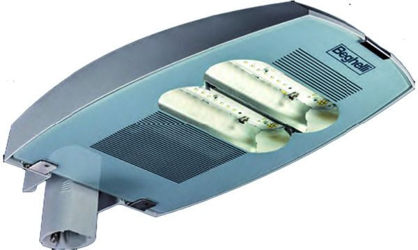 Strassen- und Wegeleuchte: Gehäuse aus druckgegossenem Aluminium und Scheibe aus Hartglas. Gehäuseober- und Gehäuseunterteil mit Scharnieren verbunden und durch Edelstahl-Verschlüsse verschlossen. Lichtlenkung durch segmentierte Reflektoren aus hochglänzendem Aluminium, asymmetrisch breitstrahlend oder asymmetrisch extrem breitstrahlend für Strassen und asymmetrisch extrem breitstrahlend für Wege. Integrierter SmartDriver als LED-Driver mit: Dimmung von 0 % bis 100 %, Speicherung des Energieverbrauches, Speicherung der Betriebsstunden. Version für Mastaufsatz oder Mastansatz.