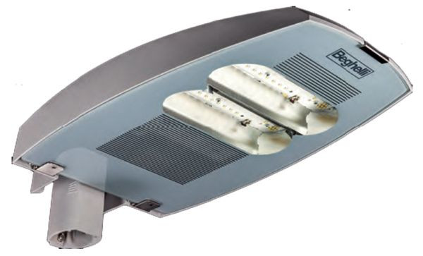 Strassen- und Wegeleuchte: Gehäuse aus druckgegossenem Aluminium und Scheibe aus Hartglas. Gehäuseober- und Gehäuseunterteil mit Scharnieren verbunden und durch Edelstahl-Verschlüsse verschlossen. Lichtlenkung durch segmentierte Reflektoren aus hochglänzendem Aluminium, asymmetrisch breitstrahlend oder asymmetrisch extrem breitstrahlend für Strassen und asymmetrisch extrem breitstrahlend für Wege. Integrierter SmartDriver als LED-Driver mit: Dimmung von 0 % bis 100 %, Speicherung des Energieverbrauches, Speicherung der Betriebsstunden. Version für Mastaufsatz oder Mastansatz.