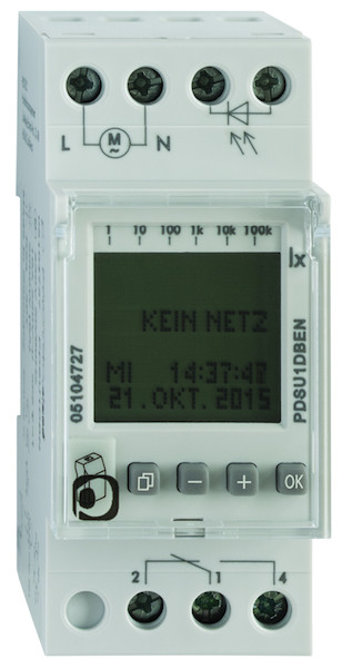 Digital, Tagesprogramm, Wochenprogramm, Astroprogramm, Kanäle: 1, Kontaktart: Wechsler, TLE: 2, Verlustleistung: 1 W, Nulldurchgangsschaltung, Ganggenauigkeit: 0,1s/ Tag, Gangreserve: 5 Jahre, Betriebsspannung: 230V AC, Schutzart: IP20, Montageart: DIN-Schiene, Ohmsch cos phi = 1: 16 A, induktiv cos phi = 0,6: 2300 VA, Glühlampen: 2000 W, LL-reihenkompensiert: 2000 VA, KLL: 1000 W, Programme: 56, Sprachen: 15, Offset-Helligkeit: 1lx - 100klx, autom. Sommer-/Winterzeit Umschaltung, Ferienprogramm, Zufallsprogramm, Betriebsstundenzähler, Relaisfunktion On/Off, Impulsfunktion, Zyklusfunktion, Synchronbetrieb, 1h-Test, Datenschlüssel, PIN-Code, Kontrast, Hintergrundbeleuchtung, kürzeste Schaltzeit: 1 Sek., Betriebstemperatur: -20 bis +55 °C, inkl. Sensor