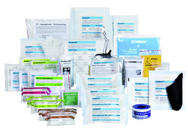 - Nach DIN 13157 plus Erweiterung für den Elektrobereich Erweiterung wie. z.B. oculav NIT Augen-Sofortspülung 250 ml, aluderm® Spezialverbände, Lederfingerling, Handgelenk-Stützbandage, Wundreinigungstücher, erhöhter Pflasteranteil