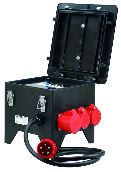 - Ausstattung (Ausgang) Klappdeckelsteckdosen: 1 x CEE 32 A, 400 V~ / 2 x CEE 16 A, 400 V~ / 3 x Steckdose 230 V~