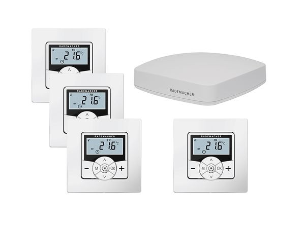 Das Starterpaket Heizen enthält vier DuoFern Raumthermostat 2 (32501872) und einen HomePilot (34200819). Der HomePilot ist die zentrale Steuereinheit für alle RADEMACHER Funk-Produkte, für bis zu 100 Geräte. Über ihn lassen sich die eingebundenen Geräte - Rollläden, Raffstoren, Markisen, Heizung, Licht uvm. steuern. Der Zugriff kann über PC, Smartphone, Tablet oder am Gerät selbst erfolgen. Die Funk-Geräte können auch von unterwegs über die kostenlose App gesteuert werden. Das HomePilot-System kann via Sprachsteuerung bedient werden. Eine Erstellung von Gruppen, Szenen und Automationen rundet die Möglichkeiten ab. Alle Geräte, Szenen etc. können mit individuellen Namen versehen werden. Sämtliche Geräteinfos, Szenen und automatischen Abläufe sind lokal auf dem Gerät gespeichert. Das Funk-Raumthermostat 2 ist ein Thermostat zur Einzelraumregelung von Fußbodenheizungen und Heizkörpern. Dank integrierter DuoFern Funkschnittstelle lässt sich mit dem Funk-Raumtemperaturregler Ihre Fußbodenheizung in das HomePilot Smart Home integrieren! In Kombination mit dem Heizkörperstellantrieb 2 ist ein autarkes System möglich. Dabei kann optional die gemessene Temperatur des Raumthermostates zur Steuerung des Heizkörperstellantrieb 2 genutzt werden. Das funkfähige Thermostat bietet vielfältige Anschlussmöglichkeiten, denn über den potentialfreien Relaiskontakt können neben normalen Heizungsventilen auch Kleinspannungsventile angeschlossen werden. Und via Funk kann der Funk-Raumtemperaturregler direkt mit einem DuoFern Aktor verbunden werden. Angeschlossen an ein oder mehrere Ventile ermöglicht diese Kombination somit auch eine Einzelraumregelung bei nicht vorhandener Peripherie. Mit bis zu sechs Schaltzeitpunkten, vier individuell einstellbaren Soll-Temperaturen und Tages- oder Wochenprogramm hilft das neue DuoFern Raumthermostat dabei, Heizenergie einzusparen und stellt sicher, dass die Heizung immer nur dann läuft, wenn sie wirklich benötigt wird. Besonders praktisch ist das Raumthermostat auch für den Einsatz in Wintergärten: Denn in Kombination mit dem HomePilot kann so eine temperaturabhängige Beschattung realisiert werden. Wird z.B. im Sommer eine bestimmte Temperatur über das Thermostat erfasst und an den HomePilot gesendet, löst das eine voreingestellte Szene aus: Zum Beispiel beschatten dann die Raffstoren automatisch den Wintergarten, damit sich dieser durch die Sonneneinstrahlung nicht weiter aufheizt.