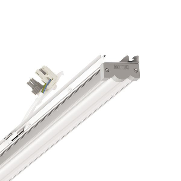 Geräteträger, aus verzinktem, profiliertem Stahlblech Oberfläche mit Polyesterharz beschichtet. Werkzeuglose Befestigung mit integrierten seitlichen Hebelverschlüssen für das schnelle Einsetzen in die Tragschiene. LED-Einheit aus Aluminium Strangpressprofil, natureloxiert, in Gehäuselänge für optisch durchlaufendes Lichtband, Stirnseiten aus Kunststoff, im Lichtband variabel positionierbar. Diffusoroptik, Lichtverteilung direkt diffus-strahlend mittels Diffusor matt aus Polycarbonat, mattierter LED Diffusor-Abdeckung, für durchlaufende Lichtband-Optik. Wärmebeständige Leitungen einschließlich Anschlussleitung 1m und Schnellmontage-Steckerteil mit werkzeugloser Phasenvorwahl und Suchfinger.