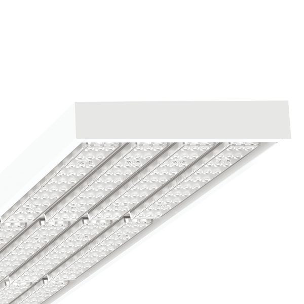 Stahlblechgehäuse pulverlackiert, rechteckiger Querschnitt, mit stabilen Stahlstirnseiten, Gehäuserückseite mit integrierten Einziehmuttern zur Befestigung des Zubehörs für Deckenmontage und Kettenabhängung von außen. Lichtverteilung direkt tief-/breitstrahlend mittels Individual.Lens.Optic aus Kunststoff PMMA. Treiber integriert. Elektrischer Anschluss über 2,3m lange Anschlussleitung 5x1,0mm².