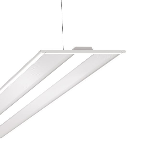 Aluminium-Strangpressprofil, Mikroprisma Diffusor, direkt 75 % indirekt 25 % strahlend, geeignet für Bildschirmarbeitsplatz, DALi-dimmbar, inkl. Pendel-Set und Endkappen, 48 Watt, 6414 lm, Maße (L x B x H): 155,8 x 32,1 x 2,4 cm. Einzelleuchte - wird bei Lichtband als Masterleuchte benötigt