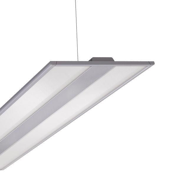 Aluminium-Strangpressprofil, Mikroprisma Diffusor, direkt 75 % indirekt 25 % strahlend, geeignet für Bildschirmarbeitsplatz, DALi-dimmbar, inkl. Pendel-Set und Endkappen, 48 Watt, 6414 lm, Maße (L x B x H): 155,8 x 32,1 x 2,4 cm. Einzelleuchte - wird bei Lichtband als Masterleuchte benötigt.