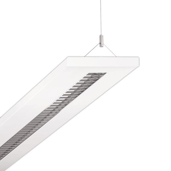 Stahlblechgehäuse, flacher rechteckiger Querschnitt, sichtbare Bauhöhe 26mm, Stirnseiten aus Stahl, Lichtverteilung direkt/indirekt strahlend mittels MIRO-SILVER® Micro-Parabolraster seidenmatt aus Aluminium, reflexionsverstärktem Aluminium-Parabolraster seidenmatt mit Niederquerschnitts-Lamellen, selbstrastend. Geeignet für Bildschirmarbeitsplätze, rundumentblendet 65° < 1500 cd/qm nach aktueller Norm DIN-EN 12464-1. Elektrischer Anschluss über integrierte transparente Anschlussleitung 3x0,75mm², Länge 1900mm, Leitungsenden abgemantelt.