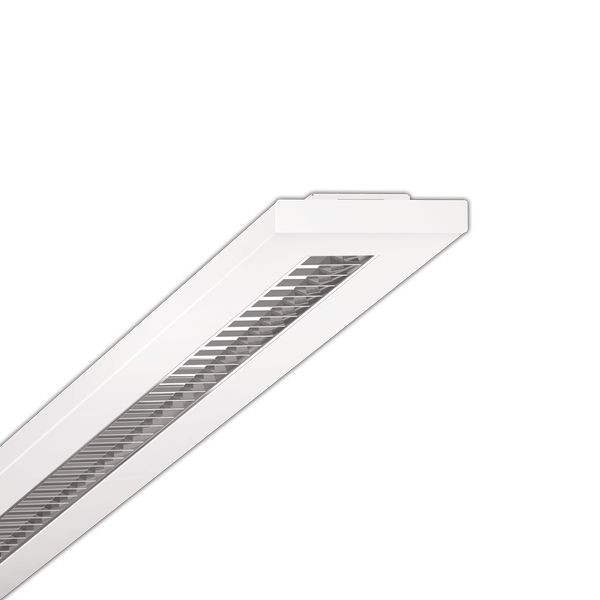 Stahlblechgehäuse, flacher rechteckiger Querschnitt, sichtbare Bauhöhe 26mm mit 30mm Deckanabstand, Stirnseiten aus Stahl, Gehäusefarbe verkehrsweiß RAL 9016. Lichtverteilung direkt strahlend mittels MIRO-SILVER® Micro-Parabolraster seidenmatt aus Aluminium, reflexionsverstärktem Aluminium-Parabolraster seidenmatt mit Niederquerschnitts-Lamellen, selbstrastend. 65° < 1500 cd/qm nach aktueller Norm DIN-EN 12464-1. Elektrischer Anschluss über 3-polige Anschlussklemme in Steckkontakt-Technik.